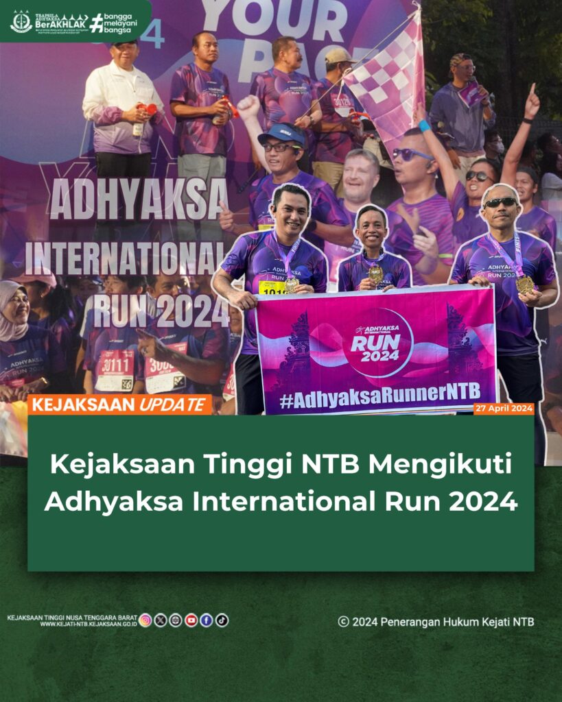 Adhyaksa International Run 2024 April 29, 2024 0 By Penerangan Hukum Kejaksaan Tinggi NTB Pada hari Sabtu, tanggal 27 April 2024 bertempat di ITDC Nusa Dua – Bali, perwakilan Kejaksaan Tinggi Nusa Tenggara Barat mengikuti Acara Adhyaksa International Run Tahun 2024. KEJAKSAAN TINGGI NTB RAIH PENGHARGAAN TERBAIK II RATA-RATA NILAI KINERJA ANGGARAN TERTINGGI KATEGORI KEJAKSAAN TINGGI Apel Kerja Pagi Kejaksaan Tinggi Nusa Tenggara Barat Diikuti Oleh Seluruh Pegawai