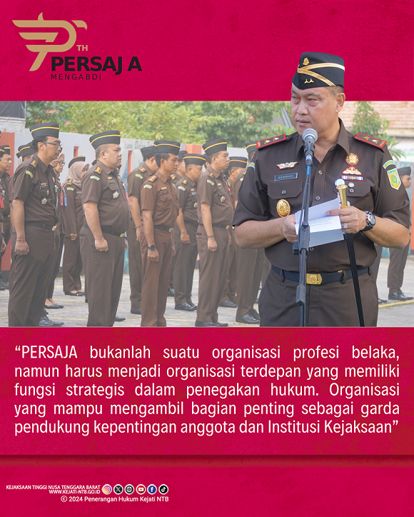 Apel ini diikuti oleh pejabat eselon II, eselon III, dan eselon IV serta seluruh pegawai pada Kejaksaan Tinggi NTB, dalam kesempatan ini Kajati NTB membacakan amanat Jaksa Agung Republik Indonesia yang mana menyebutkan bahwasanya PERSAJA bukanlah suatu organisasi profesi belaka namun harus menjadi organisasi terdepan yang memiliki fungsi strategis dalam penegakan hukum. Organisasi yang mampu mengambil bagian penting sebagai garda pendukung kepentingan anggota dan Institusi Kejaksaan.