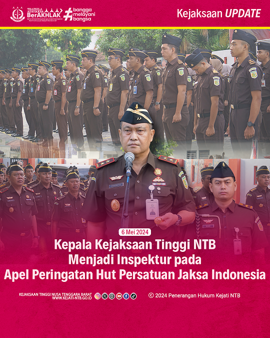 Kepala Kejaksaan Tinggi NTB, Dr. Bambang Gunawan menjadi Inspektur pada Apel Hut Persatuan Jaksa Indonesia ke-73, 6 Mei 2024.