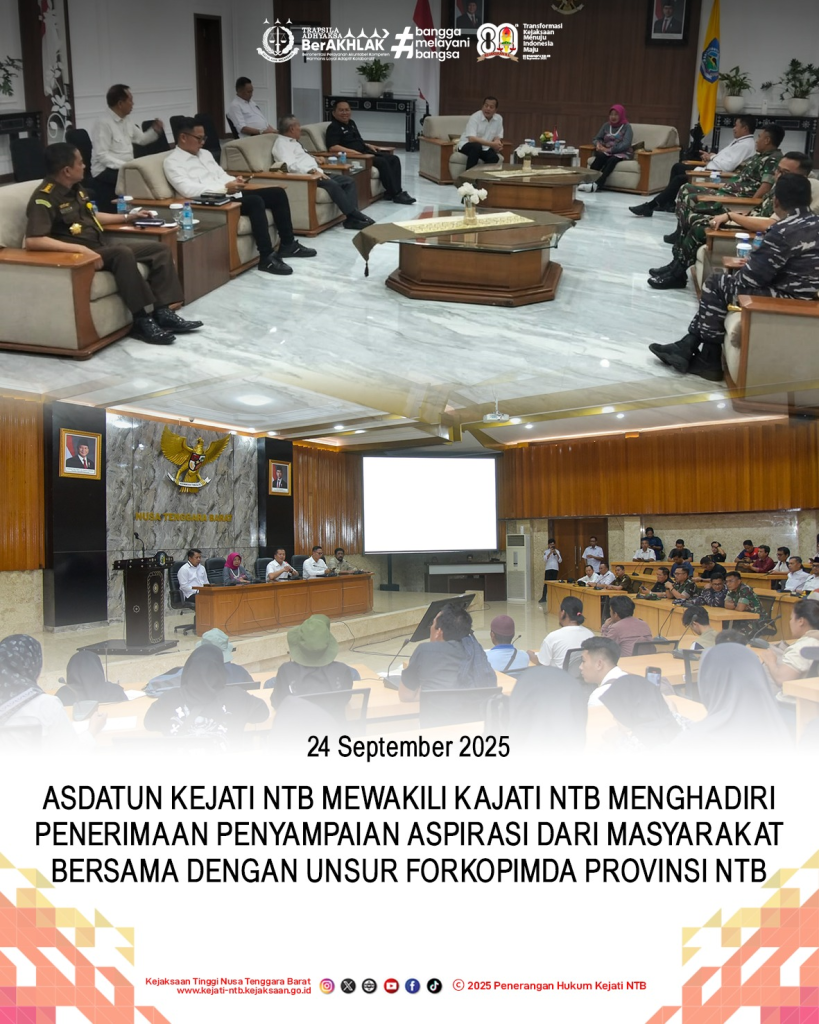 Mataram, Rabu 24 September 2025 – Kepala Kejaksaan Tinggi NTB yang diwakili oleh Asisten Perdata dan Tata Usaha Negara Bapak Ade Indrawan, SH, MH memenuhi undangan acara “Penerimaan penyampaian aspirasi masyarakat terdampak penggusuran ITDC di Tanjung Aan, pembangunan street circuit mandalika, pembangunan bendungan meninting Kabupaten Lombok Barat, penguasaan lahan oleh PT.SKE di sembalun dan gunung rinjani dan orang tua dari mahasiswa yang melakukan aksi demo gedung DPRD Provinsi NTB dan POLDA NTB” bertempat di Gedung Sasana Dharma Pemerintah Provinsi NTB.
