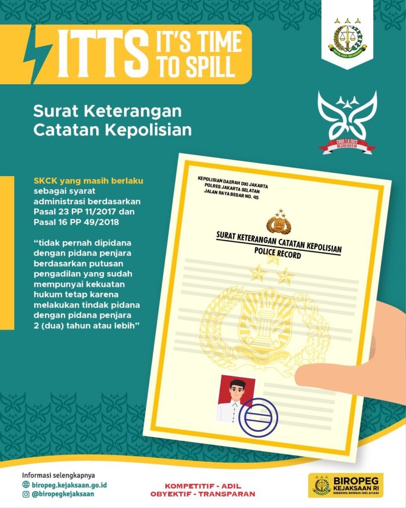 September 19, 2023Edisi ITTS masih berlanjut, yuk mulai juga siapkan dokumen SKCK kamu. Pastikan kamu berkelakuan baik, untuk menjadi bagian dri Adhyaksa sejati.