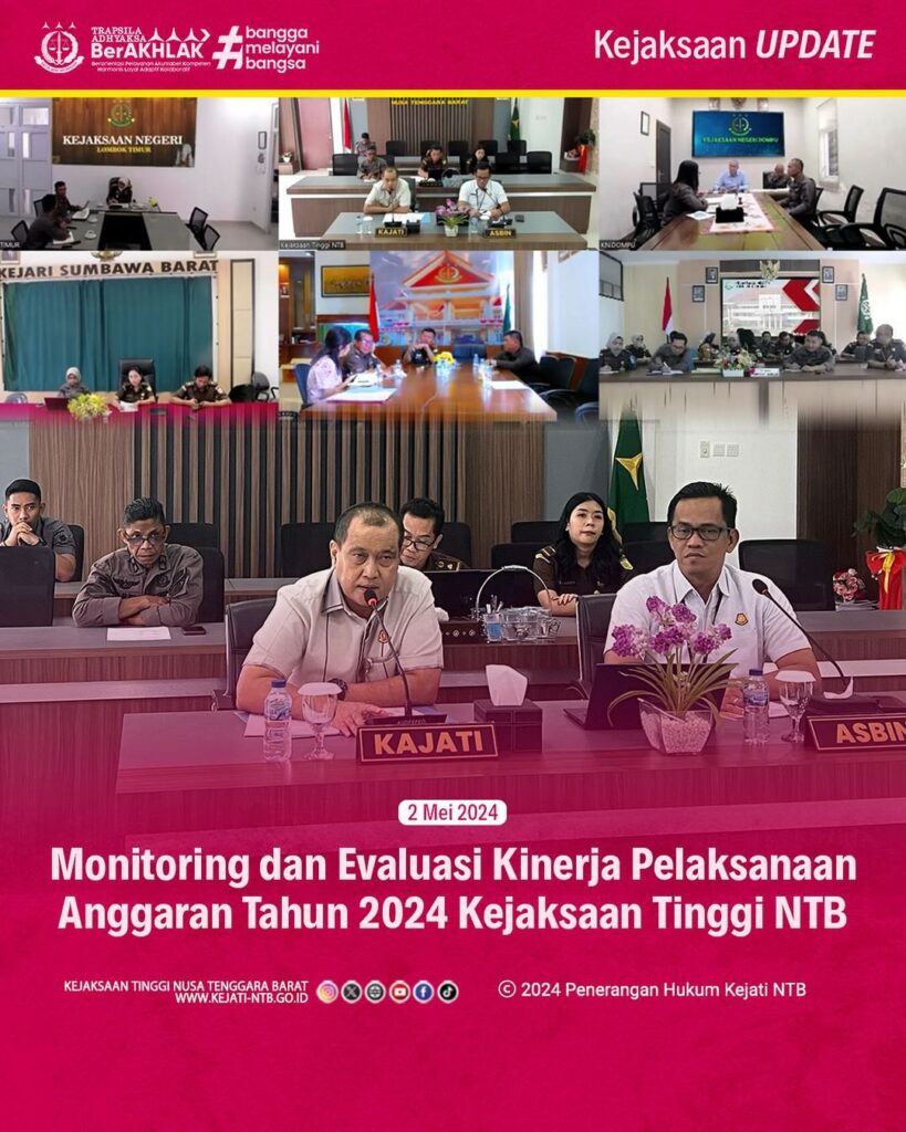 Kepala Kejaksaan Tinggi NTB, Dr. Bambang Gunawan serta Asisten Pembinaan, Iwan Setiawan, SH., MH. Beserta jajaran melaksanakan zoom Monitoring dan Evaluasi Kinerja Pelaksanaan Anggaran Tahun 2024 bersama seluruh Kejaksaan Negeri Se-NTB.