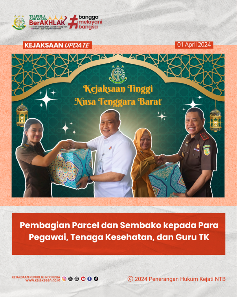 April 29, 2024Pembagian parcel dan sembako sebanyak 335 paket ini sebagai bentuk wujud tali kasih pada pegawai, tenaga kesehatan, guru TK di lingkungan Kejaksaan Tinggi NTB.