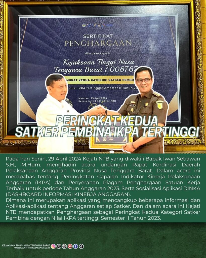 Pada hari Senin 29 April 2024 Kejati NTB yang diwakili Iwan Setiawan S.H.,M.Hum menghadiri acara undangan Rapat Kordinasi Daerah Pelaksanaan Anggaran Provinsi Nusa Tenggara Barat. Dalam acara ini membahas tentang Peningkatan Capaian Indikator Kinerja Pelaksanaan Anggaran (IKPA) dan Penyerahan Piagam Penghargaan Satuan Kerja Terbaik untuk periode Tahun Anggaran 2023. Serta Sosialisasi Aplikasi DINKA (DASHBOARD INFORMASI KINERJA ANGGARAN).