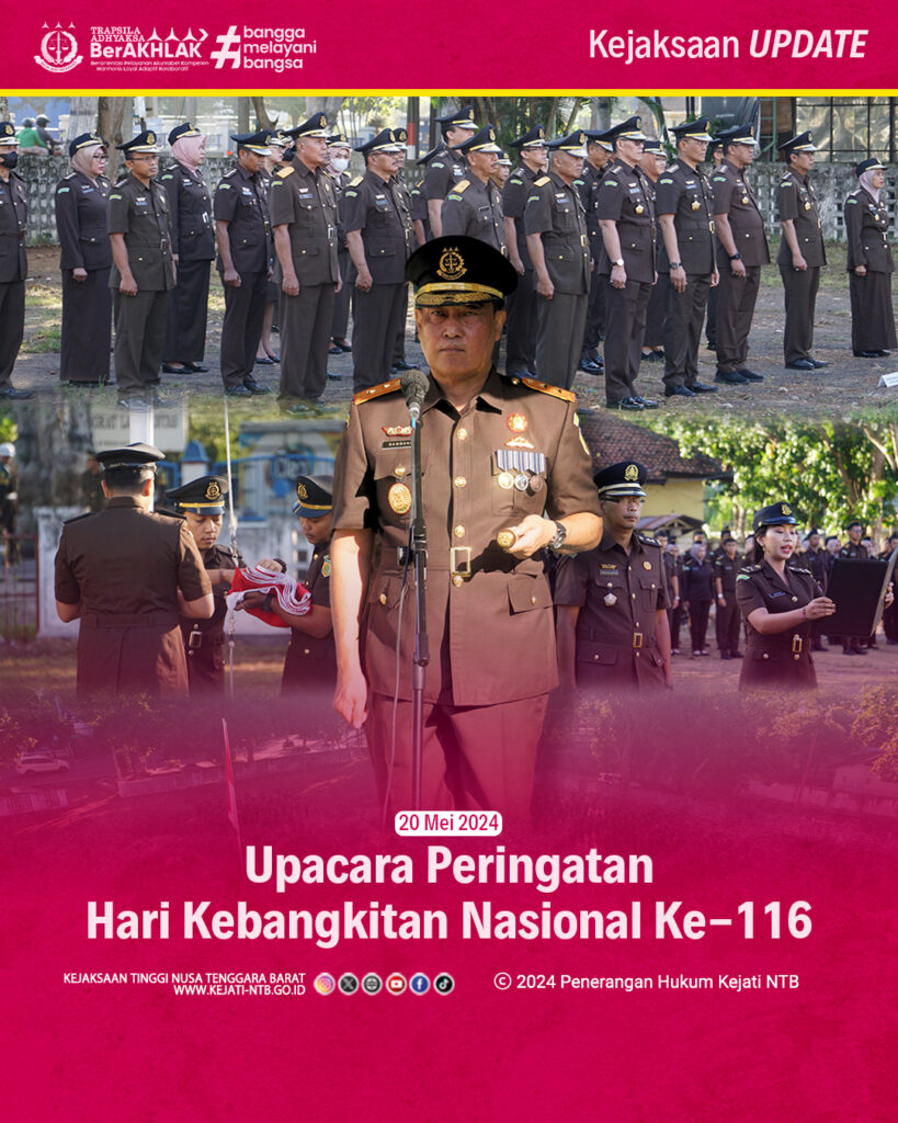 Upacara peringatan hari kebangkitan nasional ke 116 tahun 2024 pada 20 Mei 2024 bertempat pada lapangan kejaksaaan tinggi NTB dihadiri oleh kepala kejaksaan tinggi ntb, Dr. Bambang gunawan, para pejabat eselon II, eselon III, Eselon IV serta seluruh pegawai pada Kejaksaan Tinggi NTB