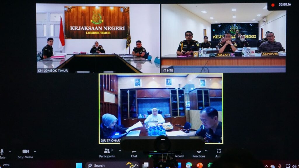Juli 20, 2023Mataram – Dalam rangka melaksanakan penegakan hukum yang berorientasi pada konsep penegakan Keadilan Restoratif atau Restorative Justice, Kepala Kejaksaan Tinggi NTB, Nanang Ibrahim Soleh, SH., MH., didampingi oleh Asisten Tindak Pidana Umum, Ikeu Bacthiar, SH., MH., Kasi Oharda Kejati NTB, Heru Sandika Triyana ,SH. Bersama Tim Jaksa RJ Kejaksaan Negeri Lombok Timur telah melaksanakan Ekspose Perkara di hadapan JAMPIDUM melalui daring dengan permohonan untuk diajukan penghentian penuntutan berdasarkan keadilan Restoratif yang diajukan oleh Kejaksaan Negeri Lombok Timur A/n tersangka Imanulloh Bin Sawaludin yang melanggar Pasal 310 ayat (4) UU RI No.22 Tahun 2009 Tentang Lalu Lintas dan Angkutan Jalan. (Kamis/20/07/2023).