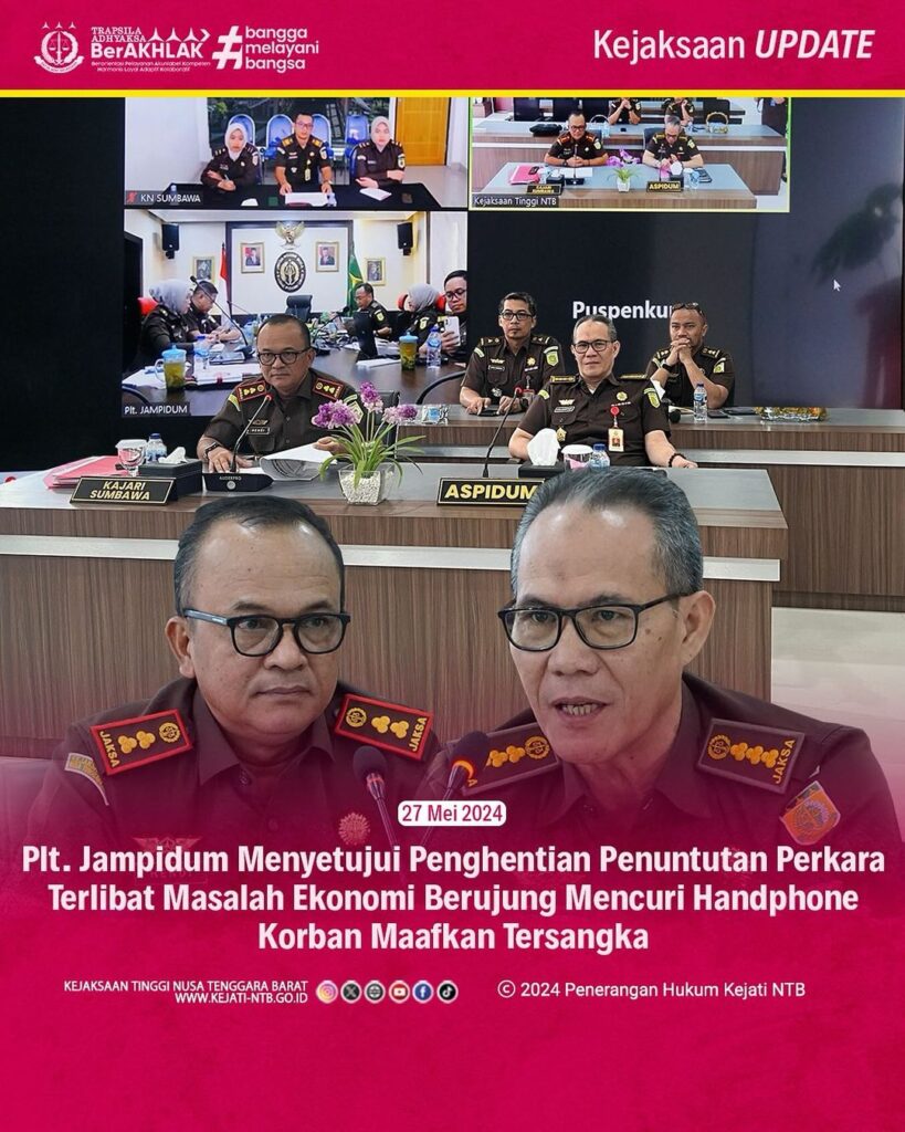 Tersangka ARI IRAWAN ALS ARI AK. AMI HUSNI yang diduga melanggar Pasal 362 KUHP. tentang pencurian , dengan difasilitasi oleh Jaksa Penuntut Umum Kejaksaan Negeri Sumbawa atas kesepakatan Bersama tanpa ada paksaan dari pihak manapun keduanya sepakat melakukan perdamaian Atas dasar perdamaian dan permohonan dari keluarga korban tersebut serta tersangka baru pertama kali melakukan perbuatan pidana dengan ancaman pidana dibawah 5 (lima) tahun, Senin, 27 Mei 2024, Kepala Kejaksaan Negeri Sumbawa, Hendi arifin , melaksanakan pemaparan perkara permohonan Restorative Justice secara virtual, dihadapan Jaksa Agung Muda Bidang Tindak Pidana Umum Kejaksaan RI dalam hal ini diwakili oleh Dir. TP OHARDA, Nanang Ibrahim Soleh, SH., MH. yang dihadiri secara virtual Asisten Bidang Tindak Pidana Umum, Ikeu Bacthiar, SH., MH didampingi oleh Para Kasi Oharda, Heru Sandika Triyana, SH. dan Kasi Penkum, Efrien Saputera, SH., MH. Hasil dari pemaparan, Penghentian Penuntutan Perkara berdasarkan restorative justice atas nama tersangka ARI IRAWAN ALS