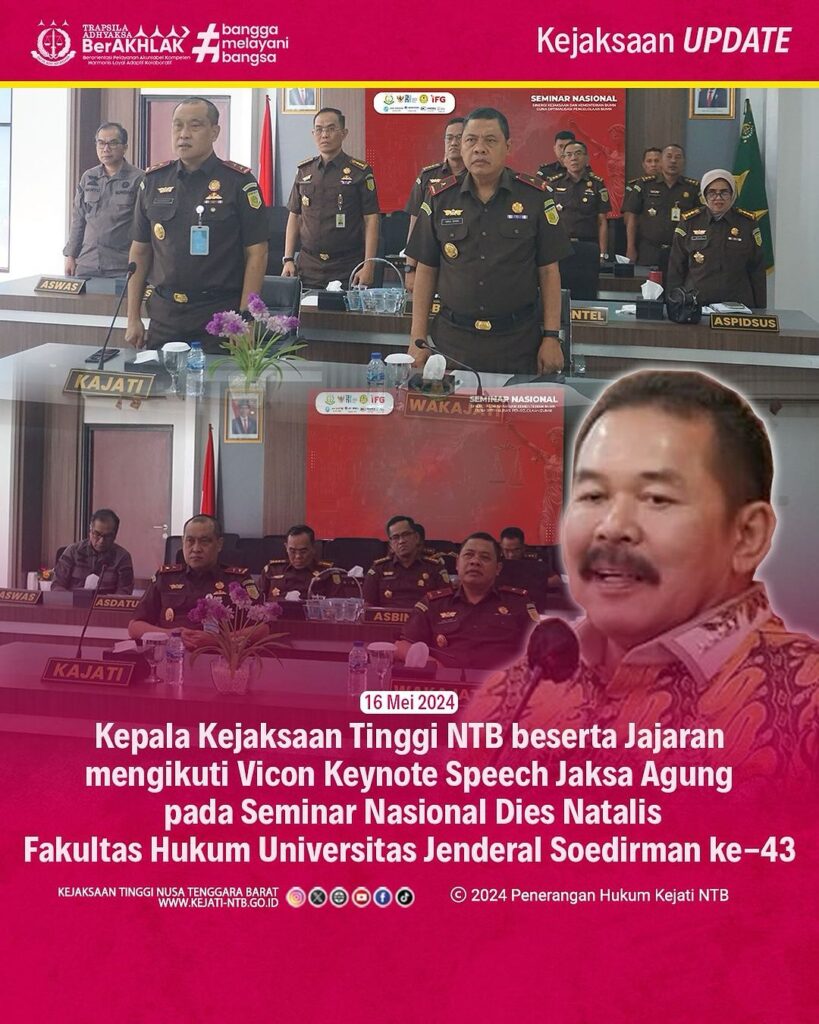 Kepala Kejaksaan Tinggi NTB, Dr. Bambang Gunawan, para pejabat eselon II dan Eselon III, Mengikuti Video Conference Keynote Speech Jaksa Agung, ST Burhanuddin pada Seminar Nasional Dies Natalis Fakultas Hukum Universitas Jenderal Soedirman ke-43 pada kamis, 16 Mei 2024
